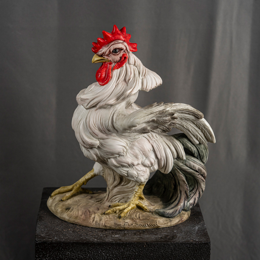 Scultura policroma in marmo rigenerato raffigurante un Gallo, soggetto decorativo ispirato alla tradizione naturalistica e rurale, simbolo di vigilanza, fierezza e rinascita.