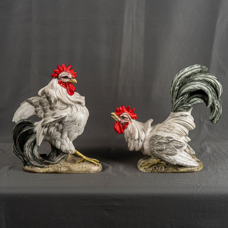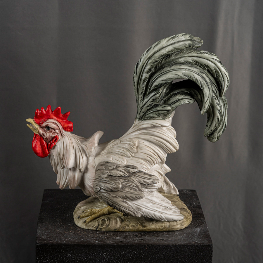 Scultura policroma in marmo rigenerato raffigurante un Gallo, soggetto decorativo ispirato alla tradizione naturalistica e rurale, simbolo di vigilanza, fierezza e rinascita.