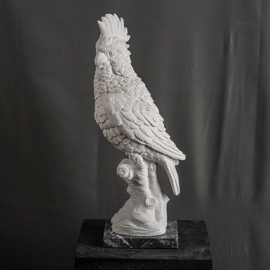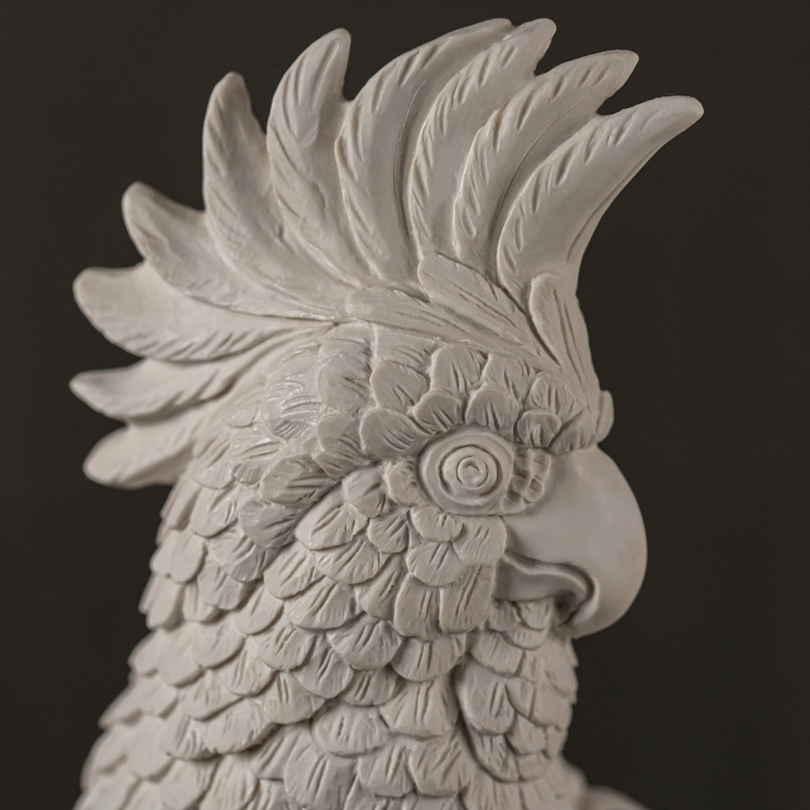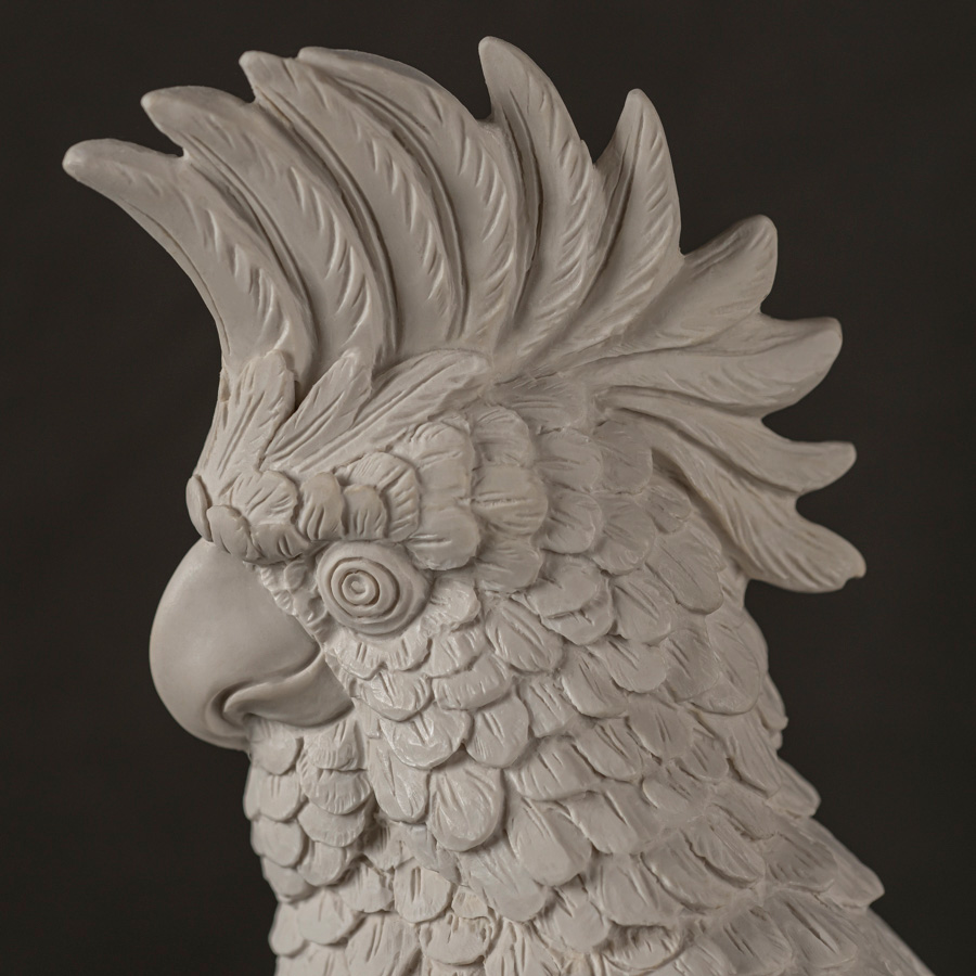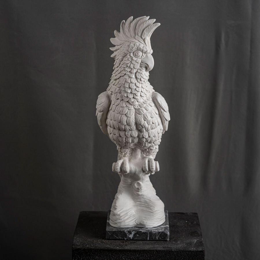 Scultura in marmo rigenerato raffigurante un Pappagallo, elegante soggetto ornamentale ispirato alla tradizione decorativa naturalistica.