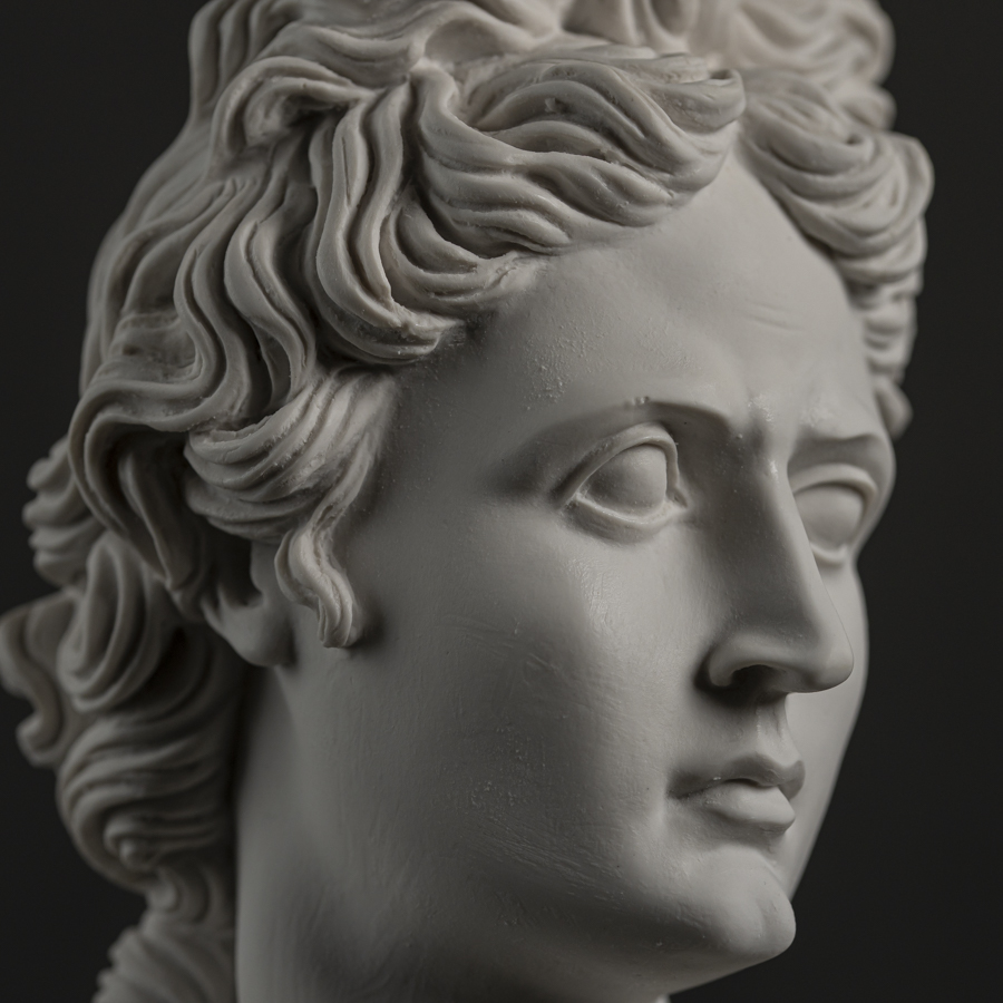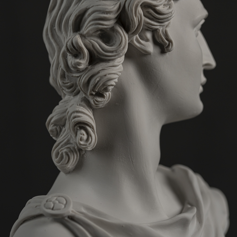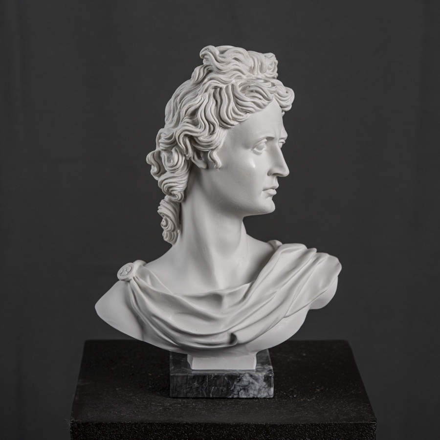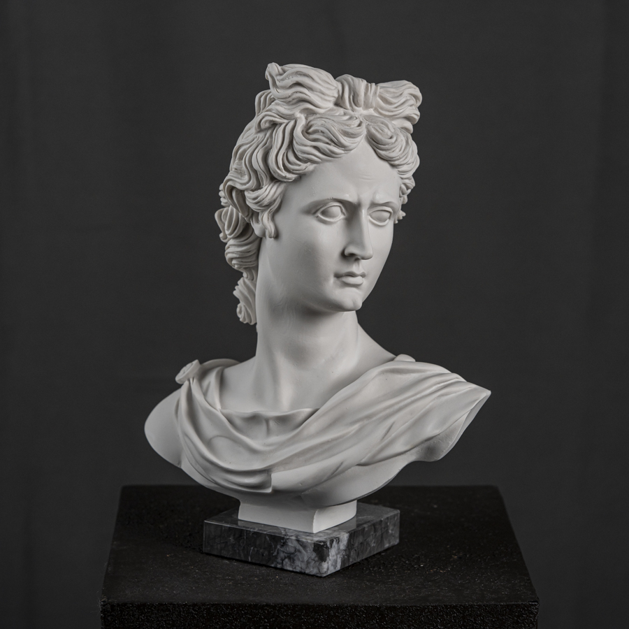 Scultura in marmo rigenerato raffigurante la divinità greca Apollo, dio della musica, delle arti mediche, delle scienze, dell'intelletto e della profezia.