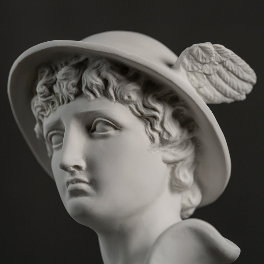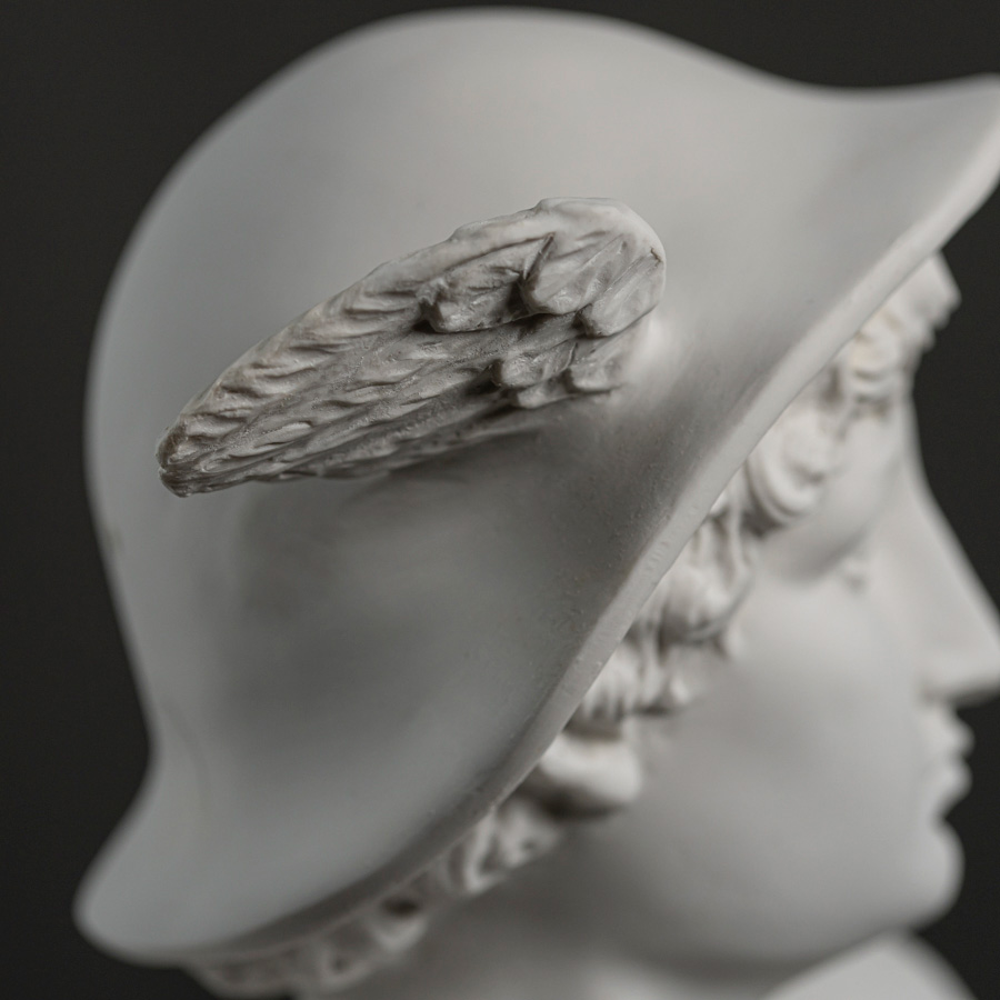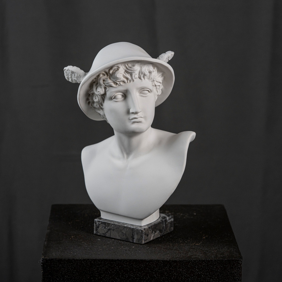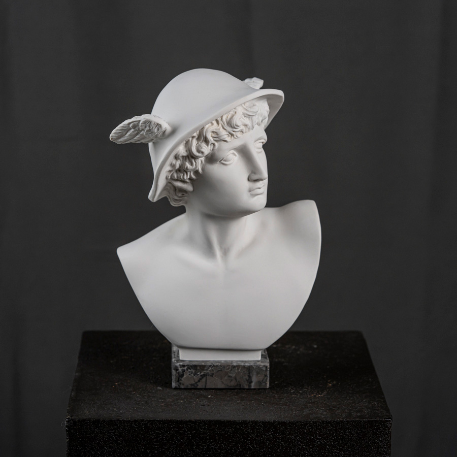 Scultura in marmo rigenerato raffigurante il busto di Mercurio, il dio romano messaggero degli dèi.