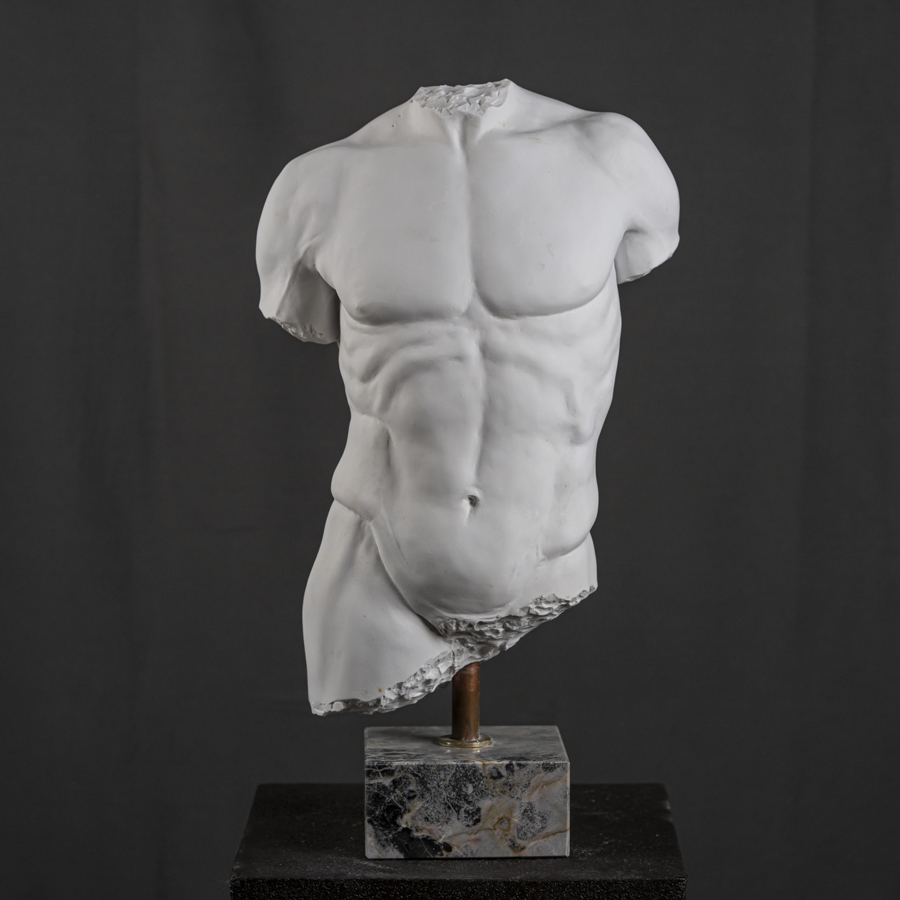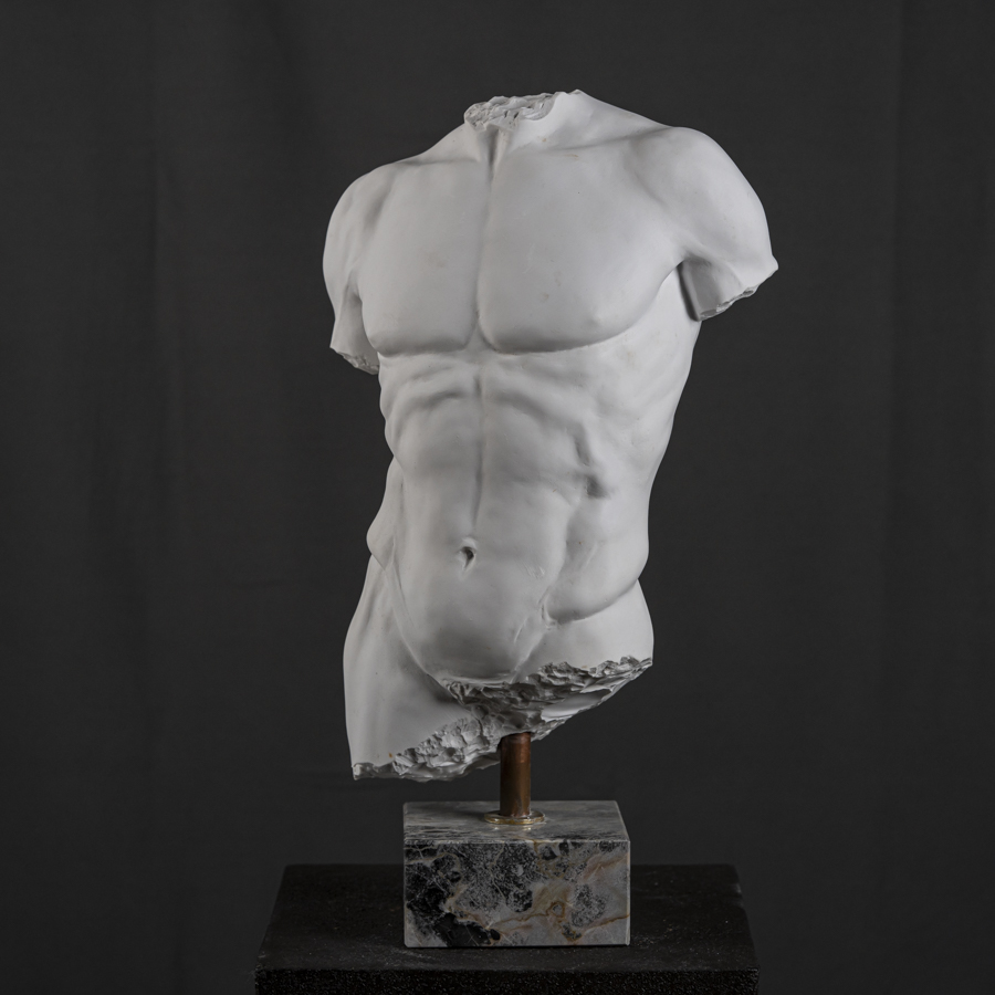 Scultura in marmo rigenerato raffigurante un frammento di uno dei due Bronzi di Riace. Questi reperti di epoca classica sono considerati tra i capolavori scultorei più significativi dell'arte greca.