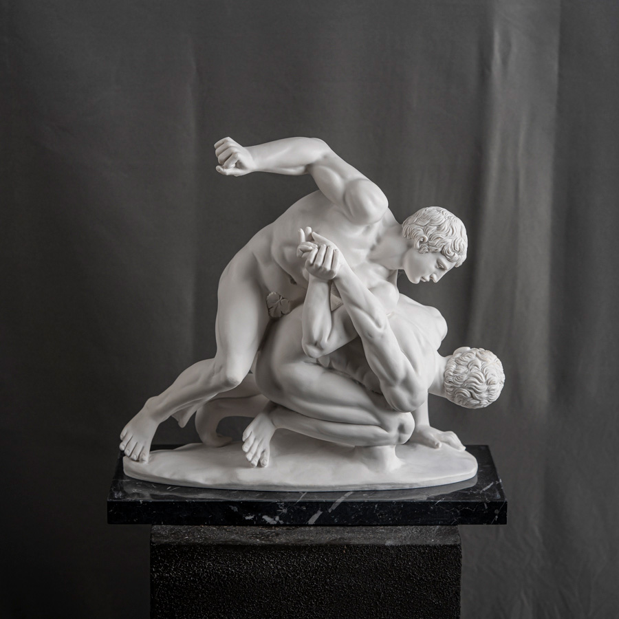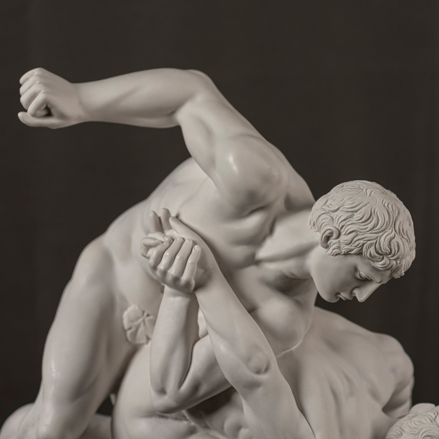 Scultura in marmo rigenerato raffigurante I Lottatori, gruppo scultoreo ispirato ai celebri modelli della statuaria greca di età ellenistica, che esaltano la tensione atletica e la perfezione anatomica del corpo umano.