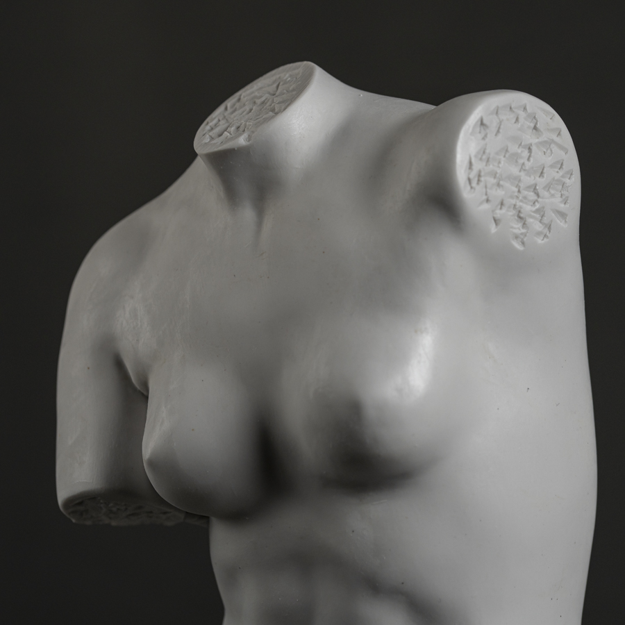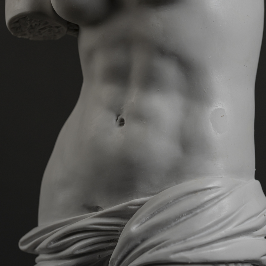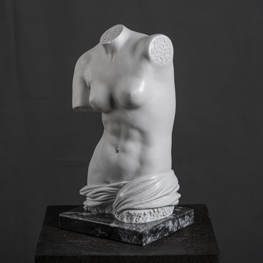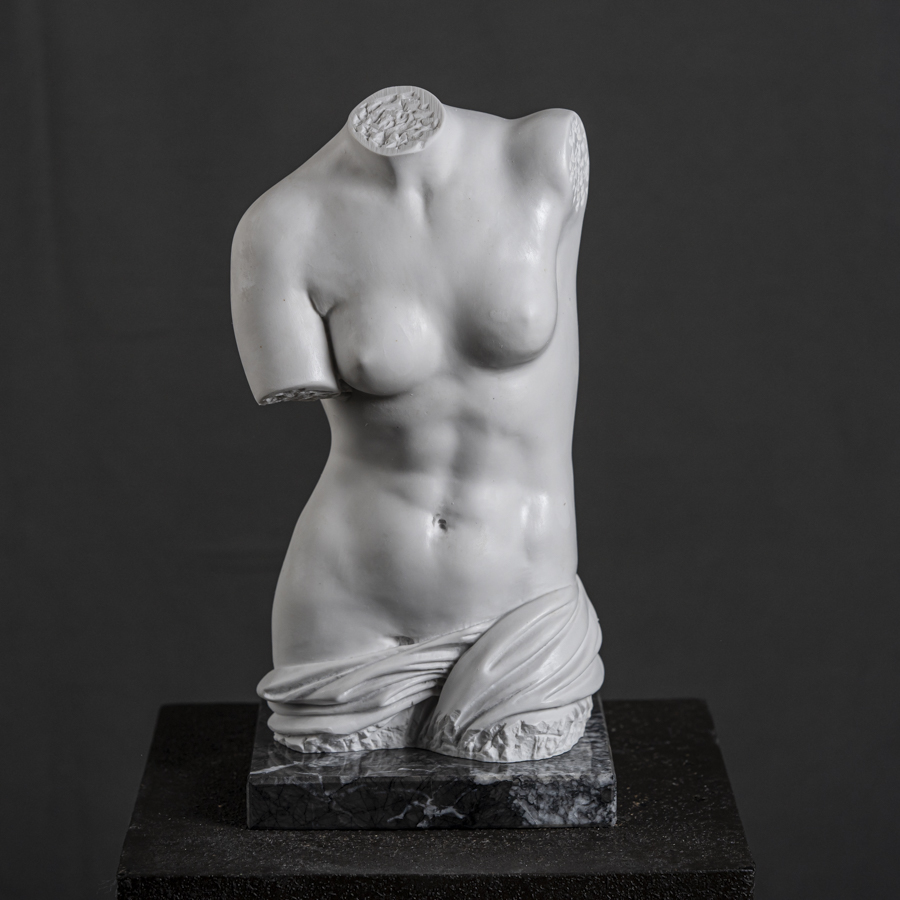 Scultura in marmo rigenerato raffigurante il torso della Venere di Milo, tra le più famose statue greche, è conservata al Museo del Louvre di Parigi.