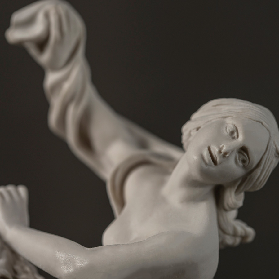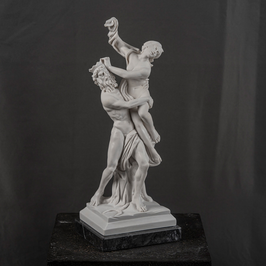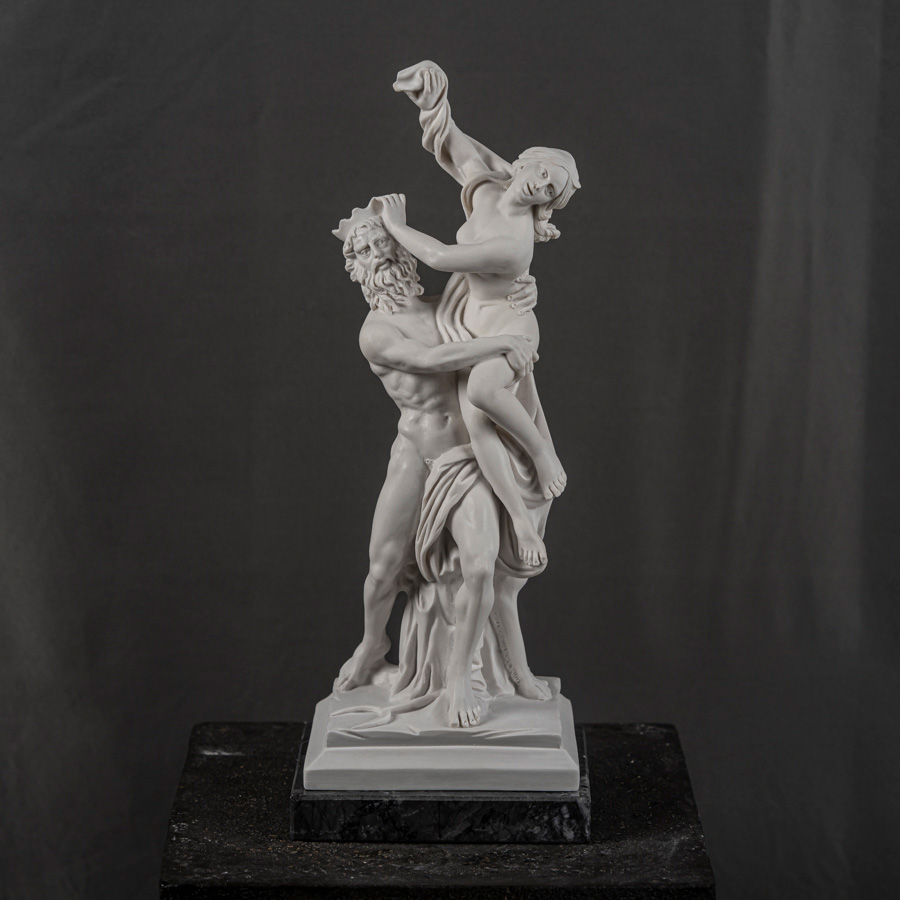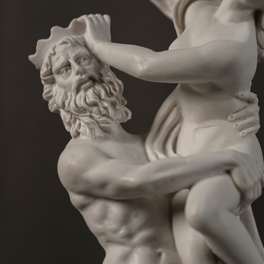 Scultura in marmo rigenerato raffigurante il Ratto di Proserpina, ispirata al celebre capolavoro realizzato da Gian Lorenzo Bernini tra il 1621 e il 1622 ed esposto presso la Galleria Borghese di Roma. L’opera rappresenta il momento drammatico in cui Plutone rapisce Proserpina, cogliendo con straordinaria intensità il contrasto tra la forza impetuosa del dio degli Inferi e la disperata resistenza della giovane.
