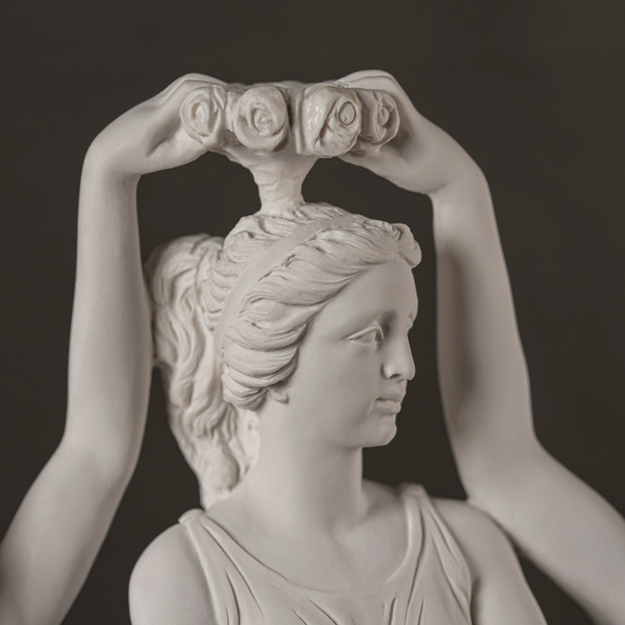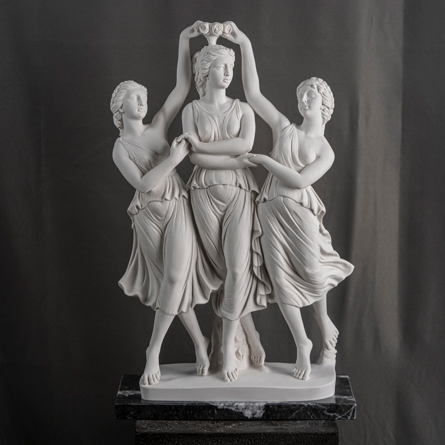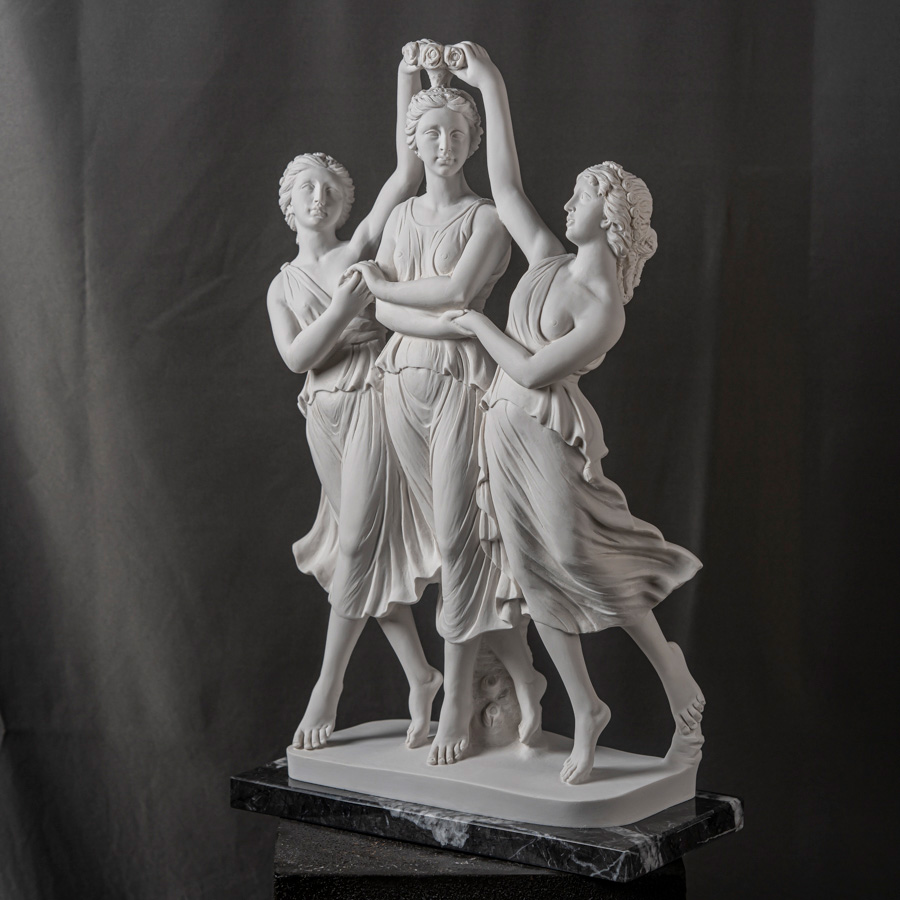 Scultura in marmo rigenerato raffigurante Le Tre Danze, composizione ispirata alla tradizione classica che celebra l’armonia del movimento e la grazia femminile.