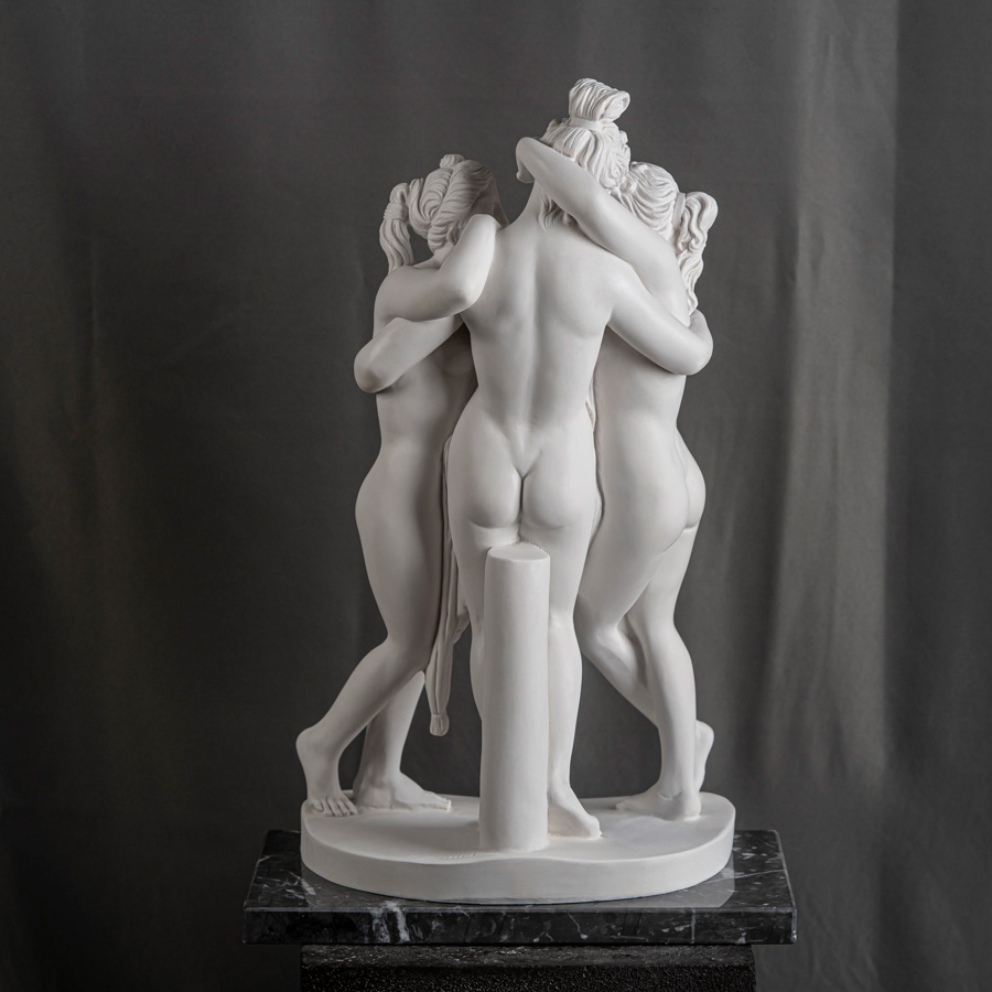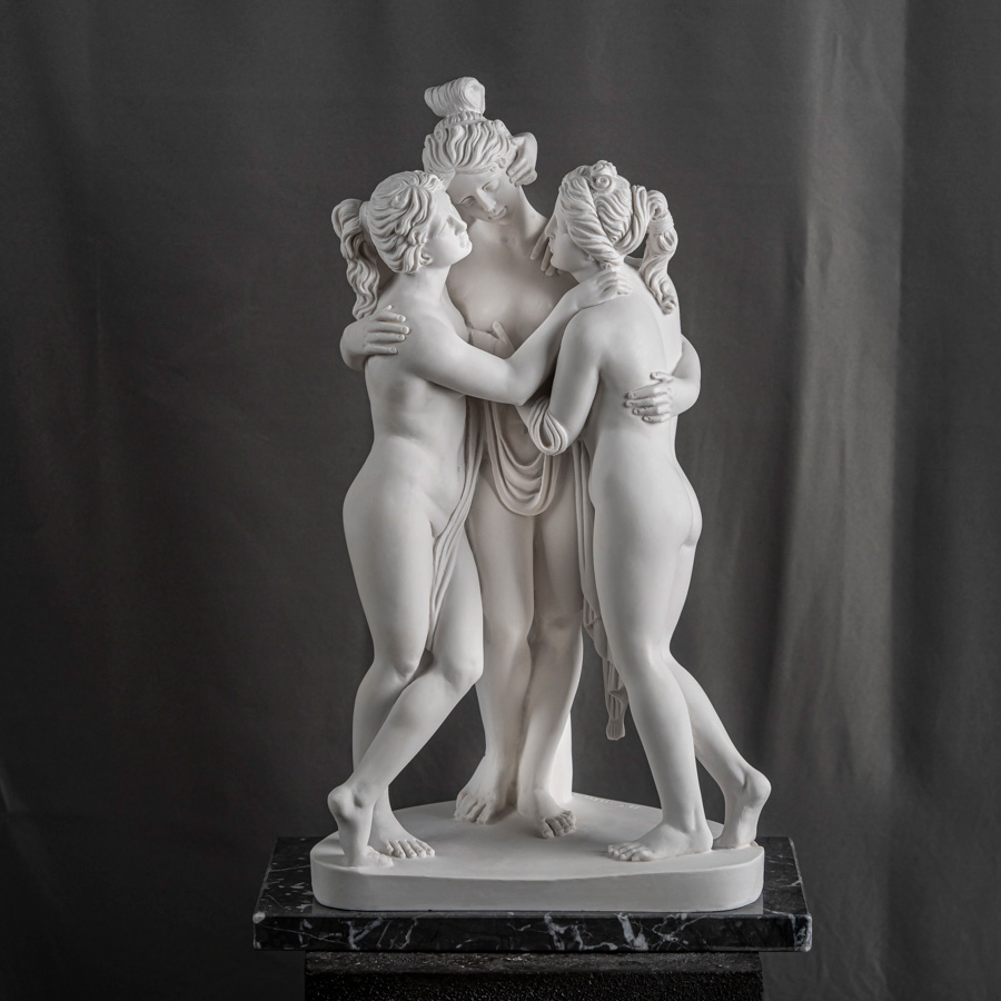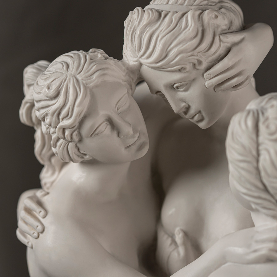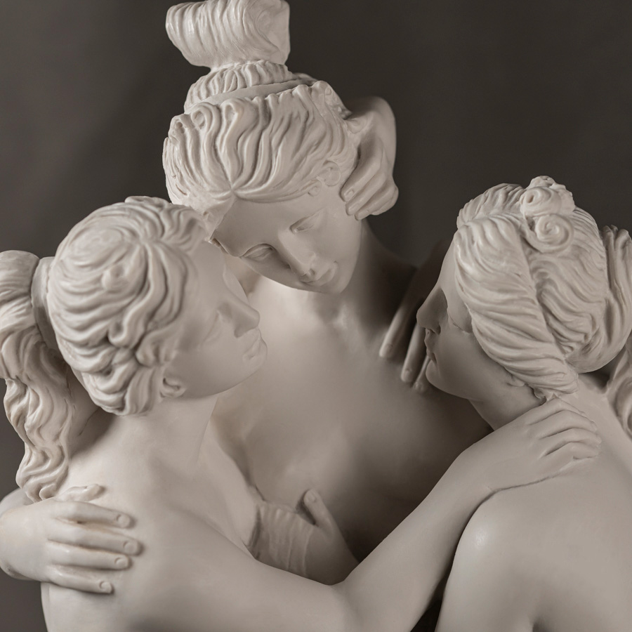 Scultura in marmo rigenerato raffigurante Le Tre Grazie, soggetto iconografico di origine classica che celebra la bellezza, l’armonia e la gioia di vivere.