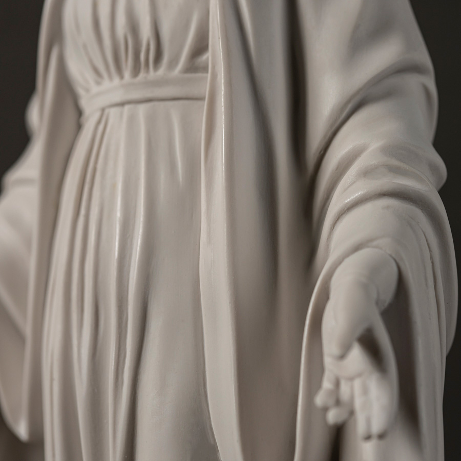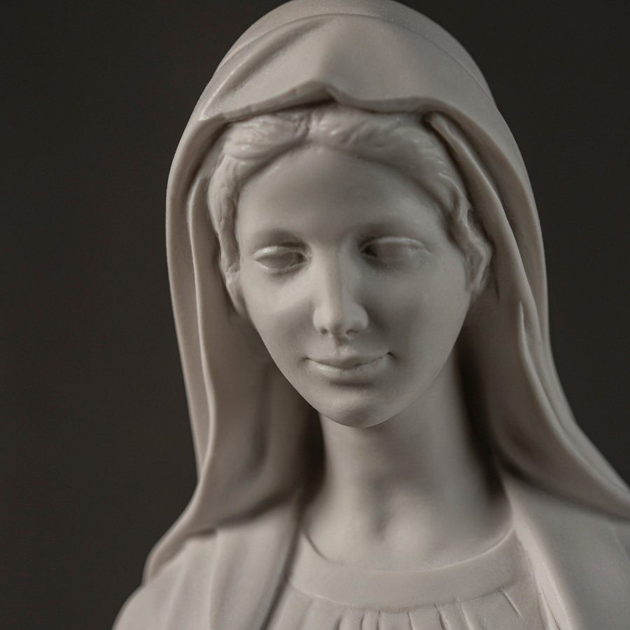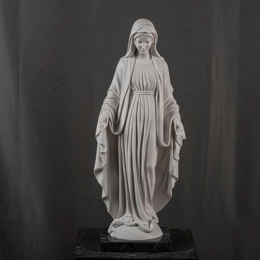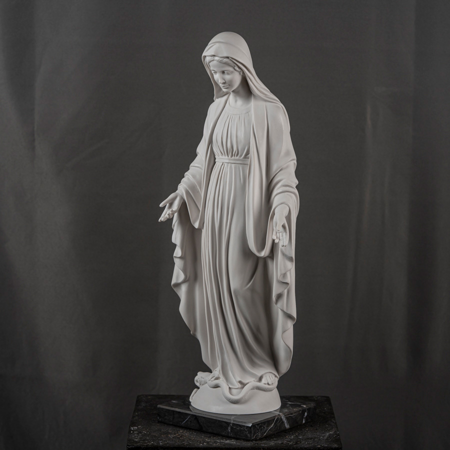 Scultura in marmo rigenerato raffigurante L’Immacolata, soggetto mariano di profondo significato teologico e devozionale nella tradizione cristiana. L’opera rappresenta la Vergine Maria in atteggiamento dolce e accogliente, con le braccia lievemente aperte in gesto di protezione e grazia, mentre i suoi piedi poggiano sul globo e sul serpente, simbolo della vittoria sul peccato.