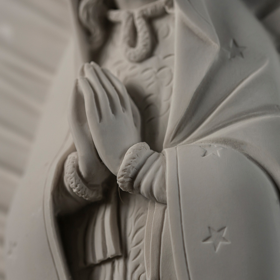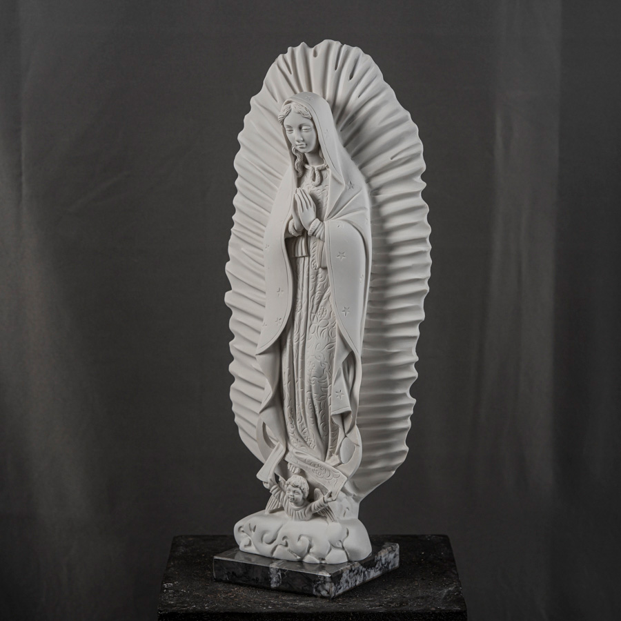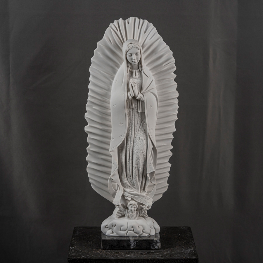 Scultura in marmo rigenerato raffigurante la Madonna di Guadalupe, ispirata alla celebre apparizione mariana avvenuta nel 1531 a Juan Diego sul colle del Tepeyac, in Messico.