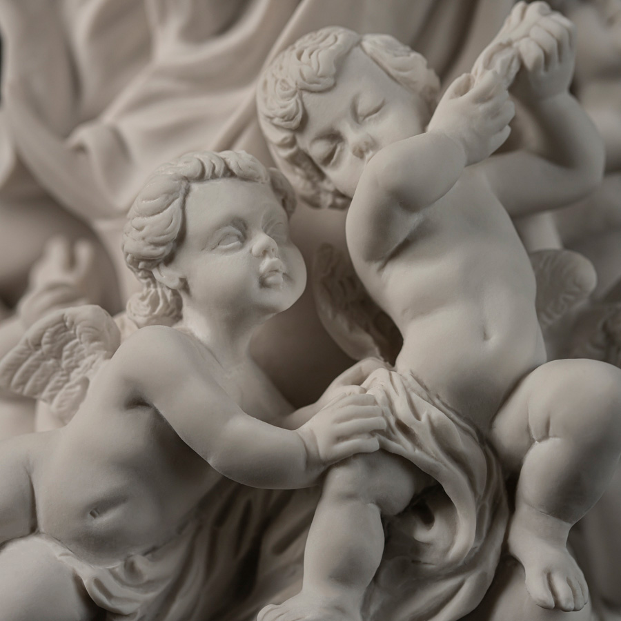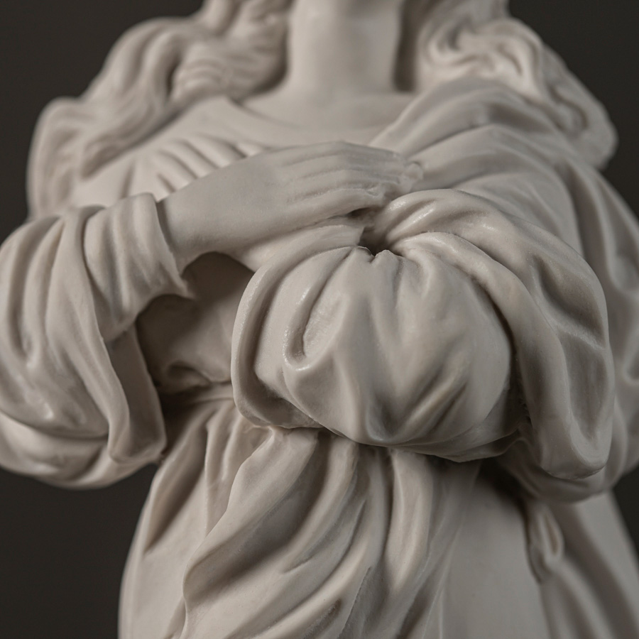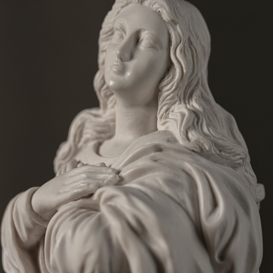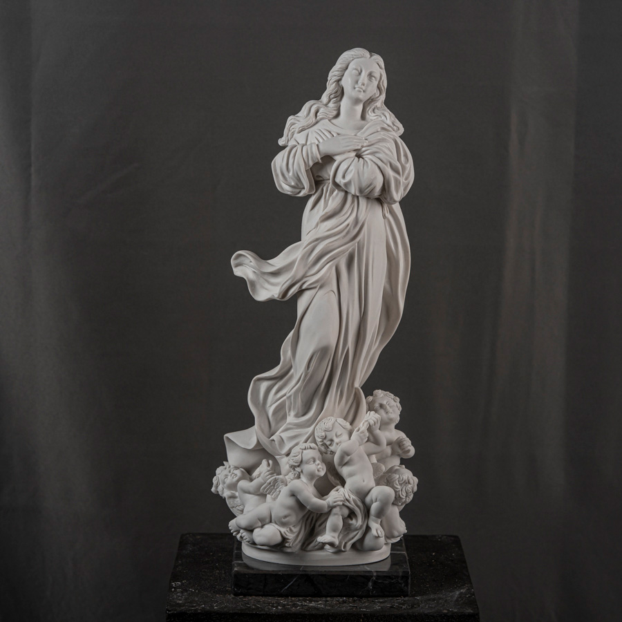 Scultura in marmo rigenerato raffigurante la Madonna di Murillo ispirata alle celebri interpretazioni di Bartolomé Esteban Murillo, realizzate nel XVII secolo e oggi conservate in importanti musei internazionali. L’opera richiama l’iconografia tipica del maestro spagnolo, con la Vergine rappresentata in atteggiamento estatico, le mani incrociate sul petto e lo sguardo rivolto verso l’alto, avvolta da un panneggio mosso e vibrante.