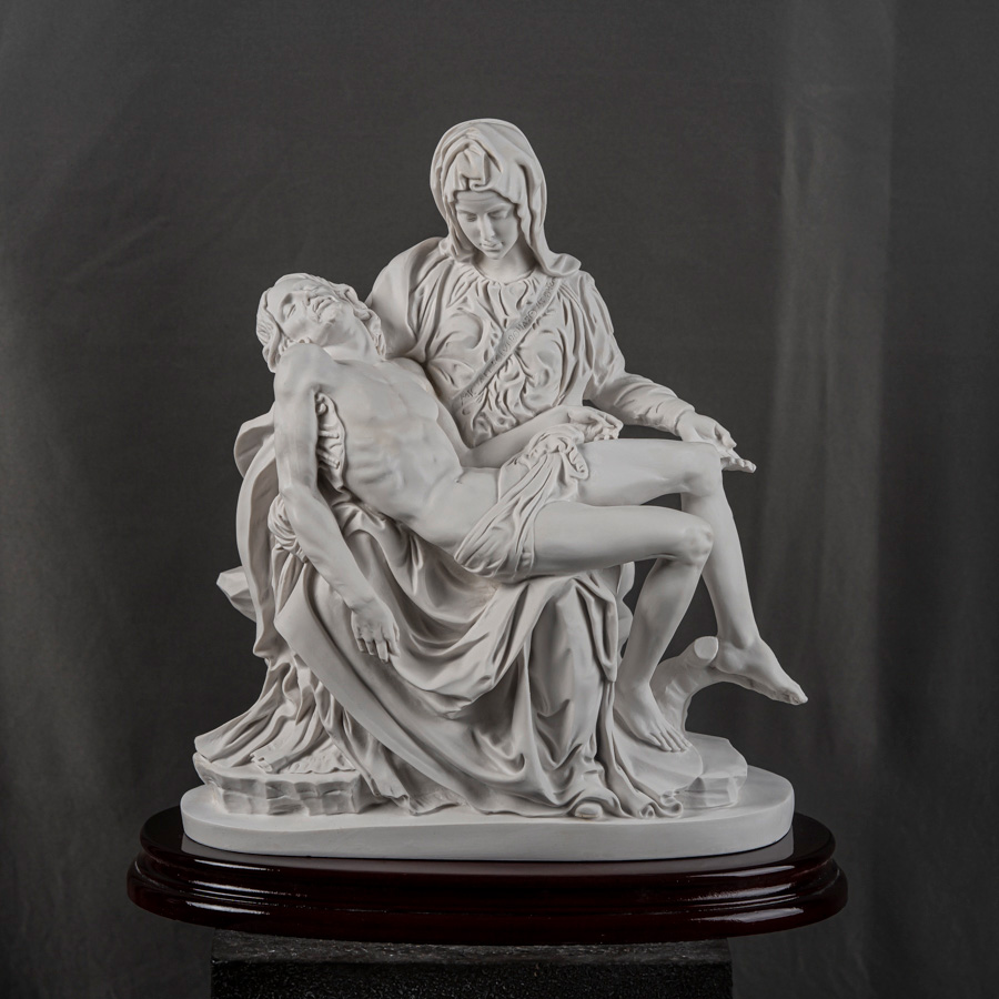 Scultura in marmo rigenerato raffigurante la Pietà, ispirata al celebre capolavoro realizzato da Michelangelo Buonarroti tra il 1498 e il 1499 e conservato nella Basilica di San Pietro in Vaticano.