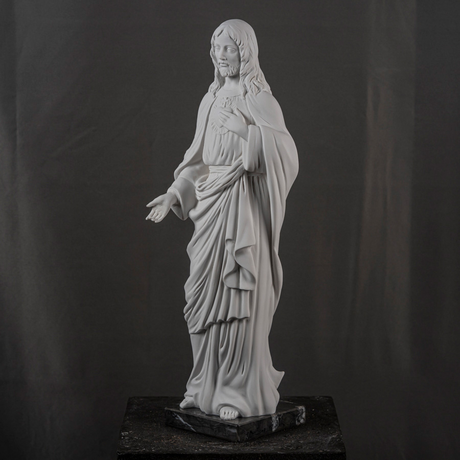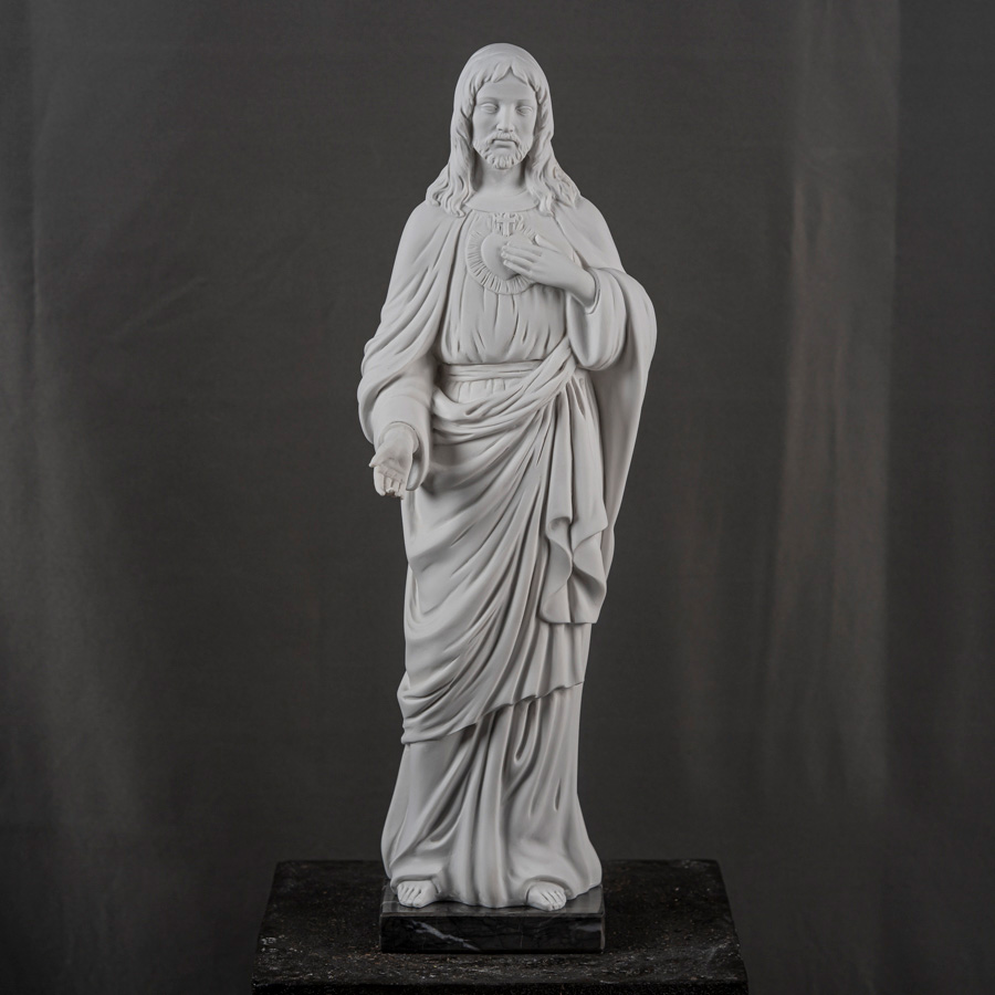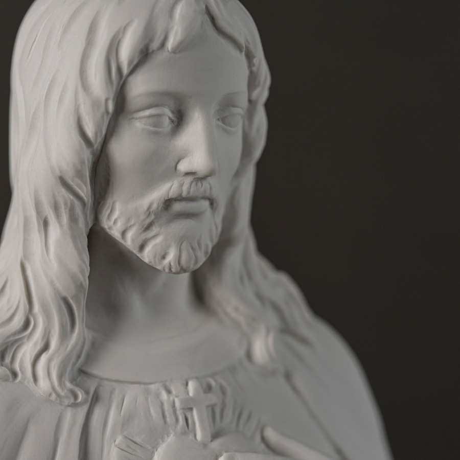 Scultura in marmo rigenerato raffigurante il Sacro Cuore di Gesù, soggetto devozionale tra i più significativi della tradizione cristiana, simbolo dell’amore misericordioso e infinito di Cristo per l’umanità. L’opera rappresenta Gesù in atteggiamento benedicente e accogliente: una mano è rivolta verso l’osservatore in gesto di invito e protezione, mentre l’altra indica il Cuore posto sul petto, emblema di sacrificio e redenzione.