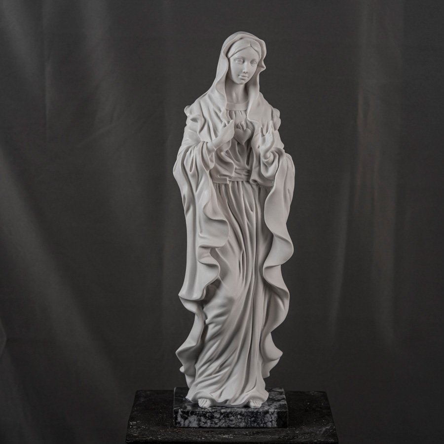 Scultura in marmo rigenerato raffigurante il Sacro Cuore di Maria, soggetto devozionale di profondo significato spirituale nella tradizione cristiana. L’opera rappresenta la Vergine in atteggiamento dolce e contemplativo, con lo sguardo rivolto verso il basso e le mani che indicano il cuore, simbolo del suo amore materno e della sua partecipazione alle sofferenze dell’umanità.