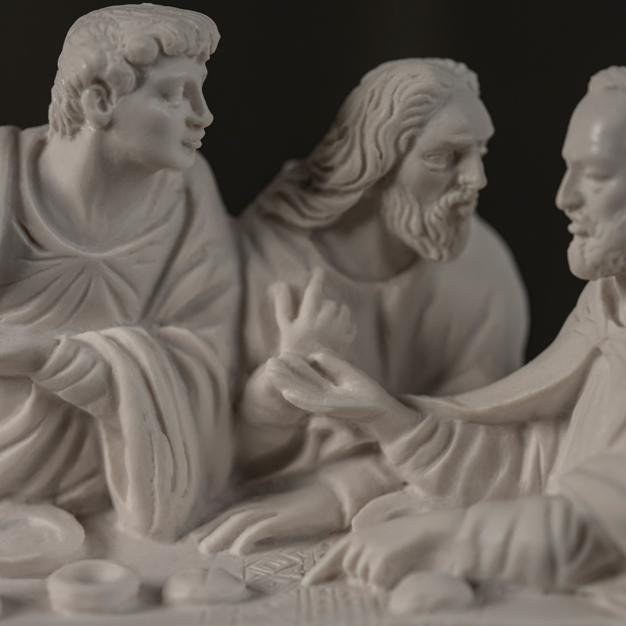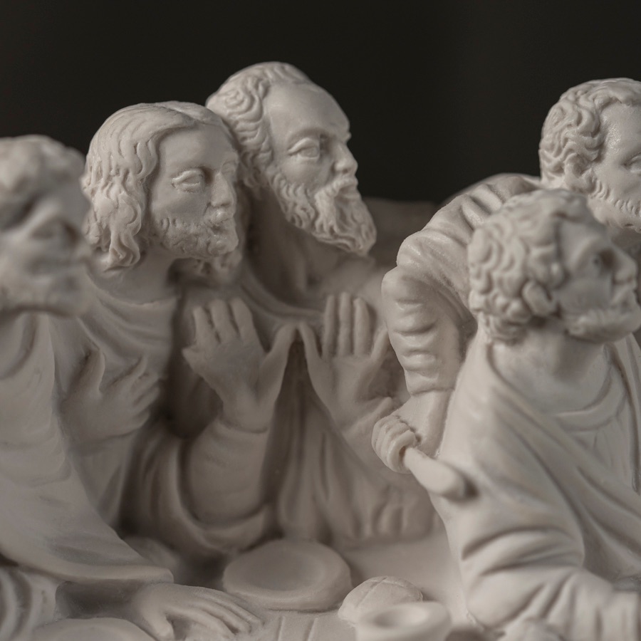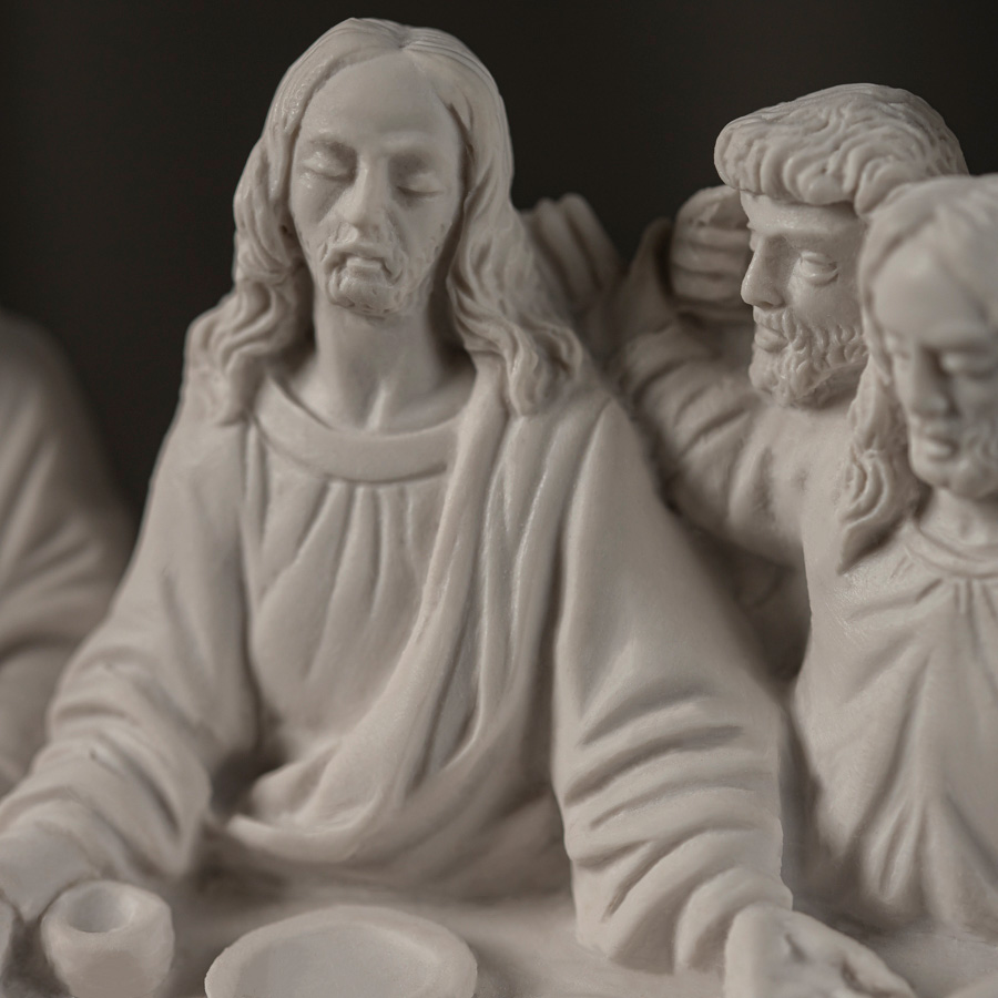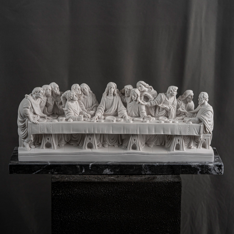 Scultura in marmo rigenerato raffigurante L’Ultima Cena, celebre scena evangelica ispirata al capolavoro realizzato da Leonardo da Vinci tra il 1495 e il 1498 nel refettorio di Santa Maria delle Grazie a Milano. L’opera riproduce in forma plastica il momento in cui Cristo annuncia il tradimento, cogliendo l’intensità emotiva e le reazioni dei dodici apostoli disposti attorno alla tavola.