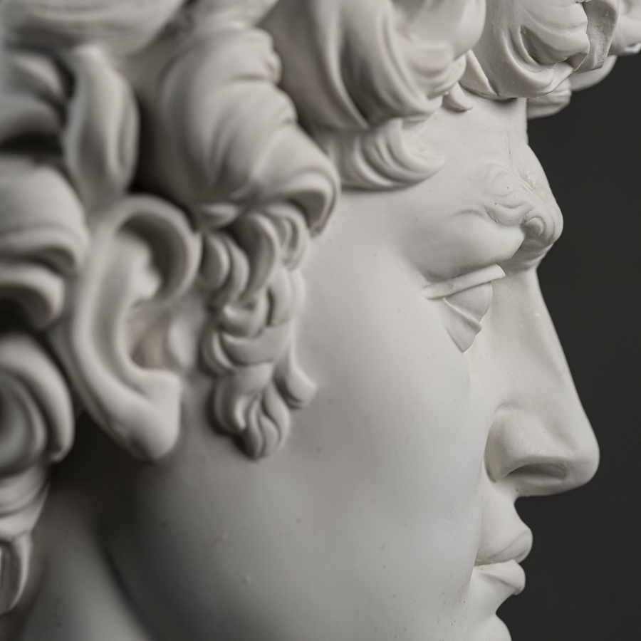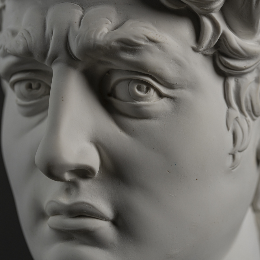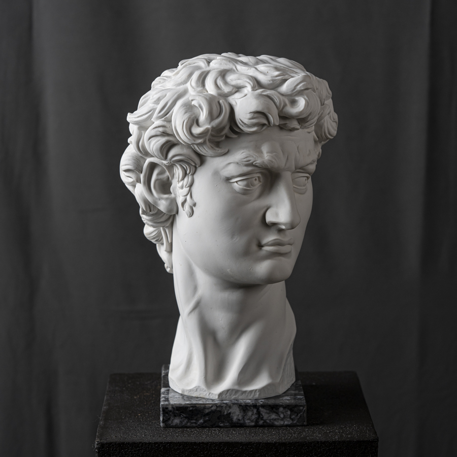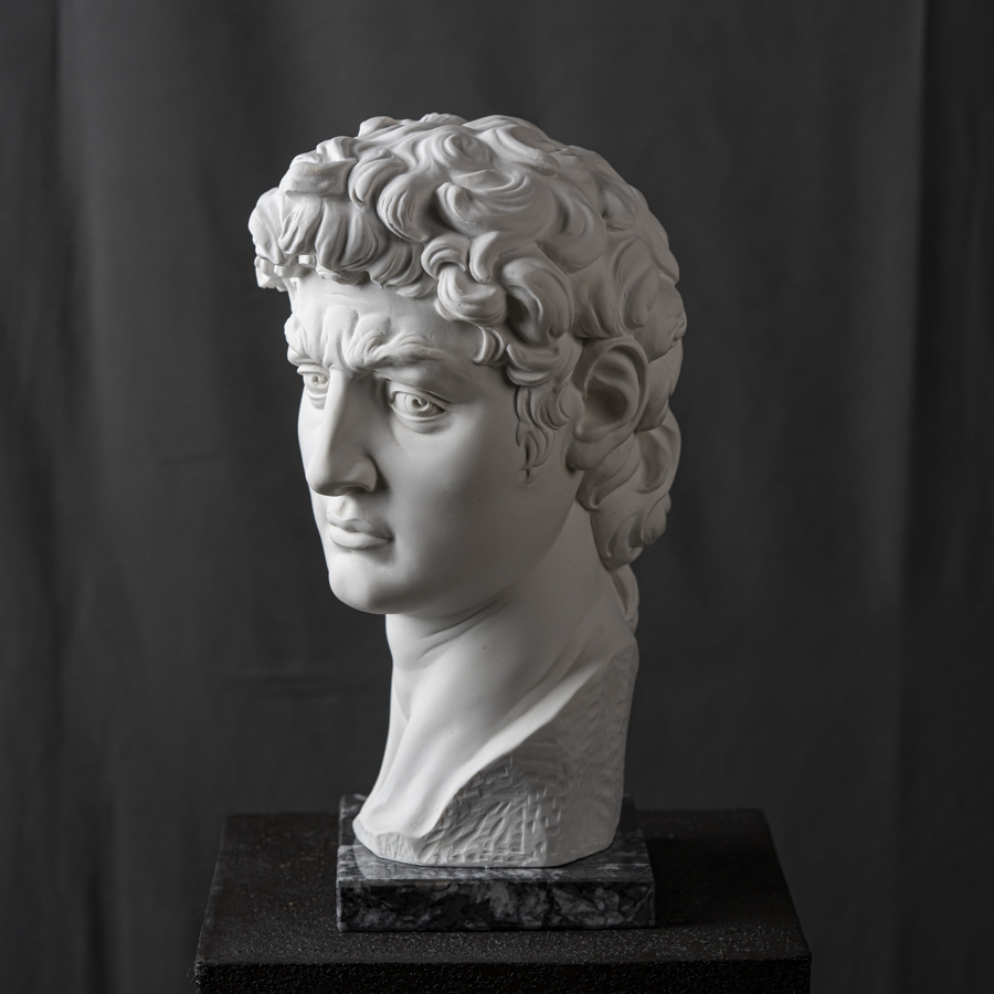 Scultura in marmo rigenerato raffigurante il volto del David di Michelangelo Buonarroti, capolavoro della scultura mondiale e uno degli emblemi del Rinascimento nonché simbolo di Firenze e dell'Italia all'estero.